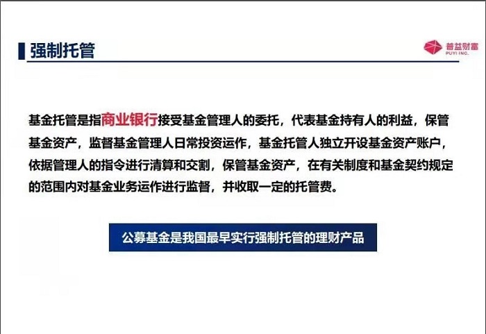 那另外一個呢,基金投資人就是咱們普通老百姓,也是基金投資人呢,還有機構投資者,那另外一個就是基金托管人,就是來保管著咱們資金的安全的就是基金托管人,第一班是有商業銀行或者證券公司,他們還必須得有托管的資質,當然了,還有基金代銷機構,也就是去銷售基金的,比如說一些商業銀行呀,證券公司呀,期貨公司呀,還有一些第三方的獨立的基金代銷機構,像咱們的普益基金就是基金代銷機構。